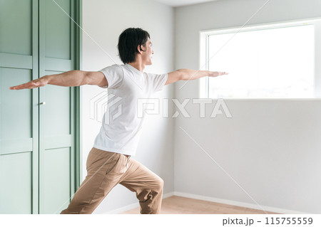 年輕的亞洲男子在家做瑜珈/普拉提(戰士姿勢)