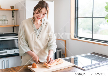 年輕的亞洲女人在廚房做飯(切菜、用刀、烹飪、家常菜)