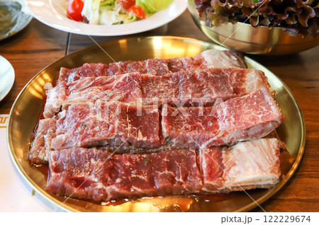 Sliced Barbecue Pork on the Grill with smoke, Korean Style food