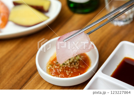 Chinese jade noodles topping roasted crispy pork dipping sweet soy sauce on plate