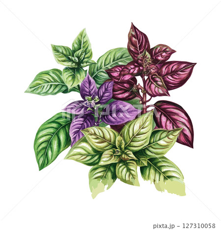 Vibrant Basil Herb Illustration Purple Green and Variegated Leaves