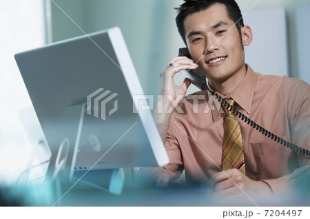 Asian businessman leaning on the wall smiling