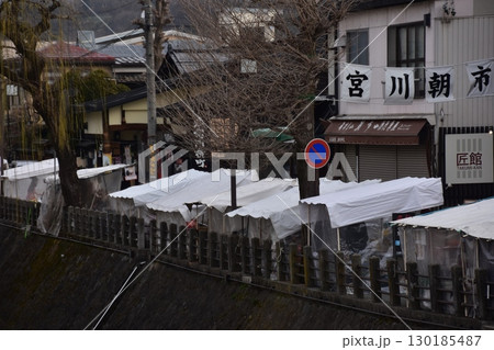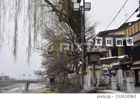 日本岐阜縣高山市 — 宮川早市,一個旅遊景點,有販售當地特色菜的攤位和購物街 — 高山節期間的早晨景色
