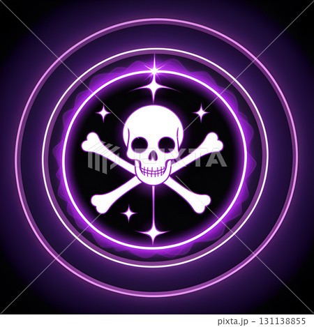 Glowing purple neon skull and crossbones symbol with shimmering stars and concentric circles on black