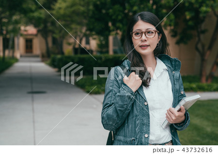 Inspired Asian female college student touching her glasses, holding her laptop.