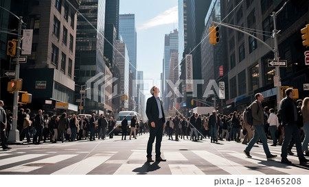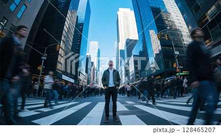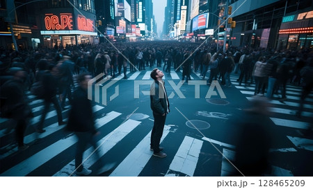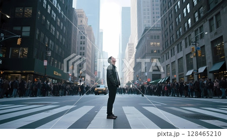 一名男子停在建築物之間的行人穿越道上,抬頭仰望天空