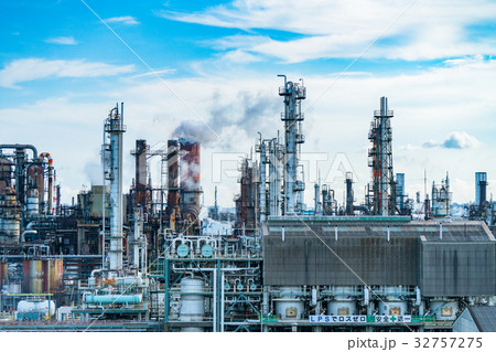 化工廠裡巨大的蒸餾塔和複雜的管道系統