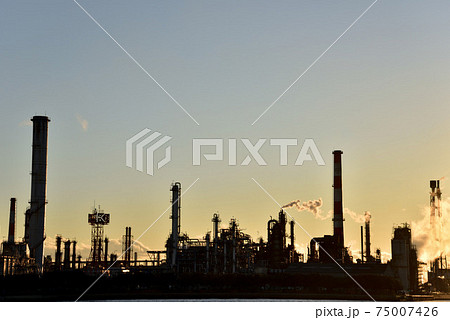 黃昏時分,工廠設施高聳於工業區之上。