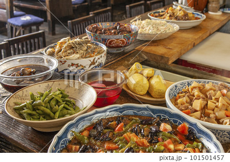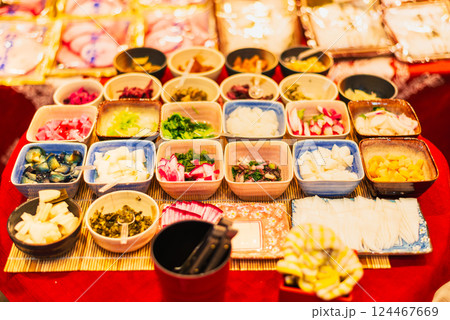 含有竹筍、芋頭、豆腐、荷蘭豆等的水煮食品。