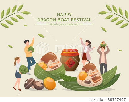 快樂的人們與中國端午節傳統食物:粽子,用竹葉包裹起來的糯米,橫幅的海報,文字翻譯:端午節