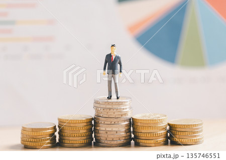 Miniature businessman standing on stacked coins with blurred pie chart background, symbolizing wealth growth, investment success, financial strategy, savings goals and economic planning.