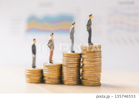 Miniature business people on stacks of coins with blurred financial report background, symbolizing income inequality, salary hierarchy, wealth distribution and investment growth concept.