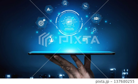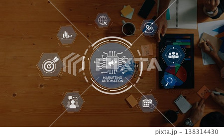 Business Team Collaborates on Marketing Automation Strategy with Digital Interface Displayed on Meeting Table from Above. Raster