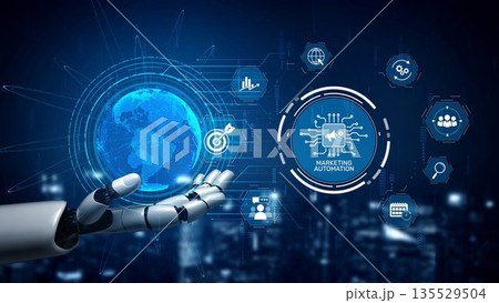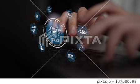 Hands Collaborating with Marketing Automation Elements on a Wooden Table, Symbolizing Digital Marketing and Workflow Efficiency. Raster