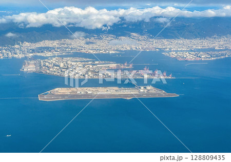 Aerial view of the Kansai International Airport (KIX) with izumisano city in background.
