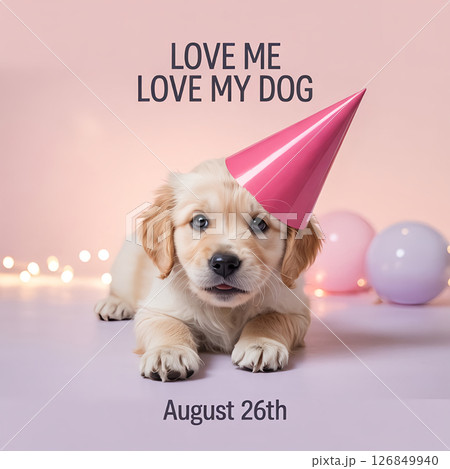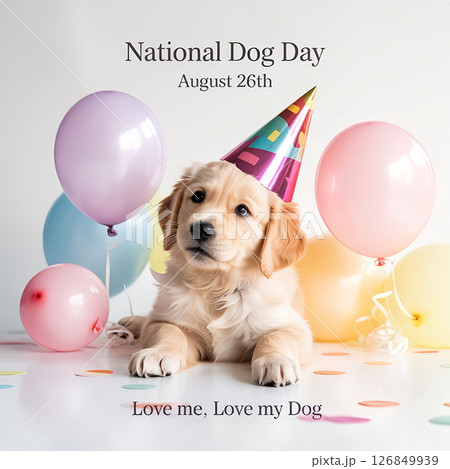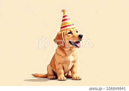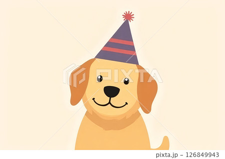 National Dog Day (Aug 26), golden retriever puppy wearing party hat in pastel minimalistic illustration style