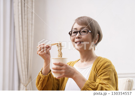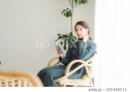 Young Asian woman happy and smiling, sitting on seat and holding mug in living room at home