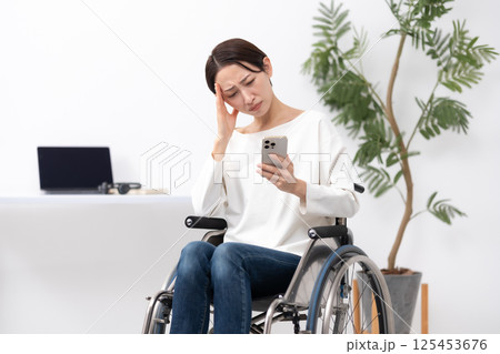 坐在輪椅上的女人在家工作,打電話,很驚訝