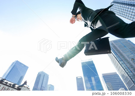 在一座被摩天大樓包圍的城市裡,一位身穿西裝、背著商務包的商人在戶外跳躍