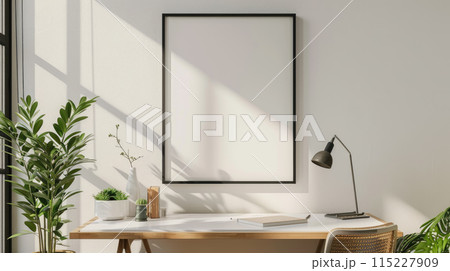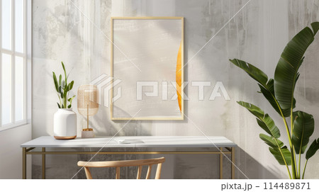 Empty picture frame mockup. A vertical wall art poster hanging on a wall above a desk.