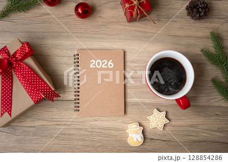 2026 notebook, black coffee cup, Christmas cookies and pen on wood table, Top view and copy space. Xmas, Happy New Year, Goals, Resolution, To do list, Strategy and Plan concept