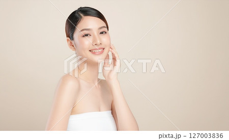 Calm young woman embracing clean laundry with joy, fresh nice scent. Linens conditioner aroma