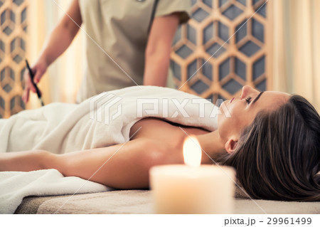 close-up of beautiful young asian woman receiving face massage in spa salon, eyes closed
