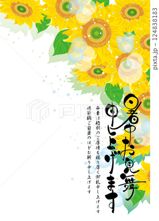 Hotemaka Omimai明信片設計(與水平的字符)|向日葵和水彩接觸的背景例證|夏天的圖像
