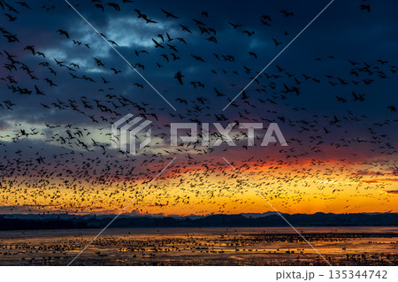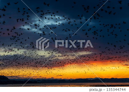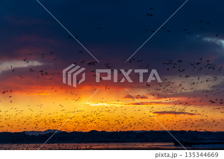 從豆沼起飛的候鳥和清晨的天空
