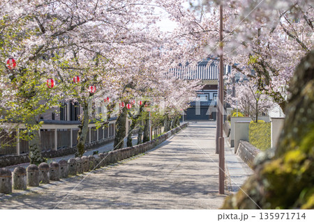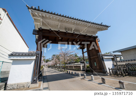 三重縣伊賀市,櫻花盛開,伊賀上野城白峰門巍然聳立。