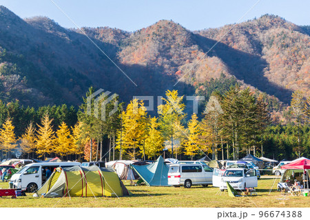 在“靜岡縣”汽車露營地連接帳篷和防水布