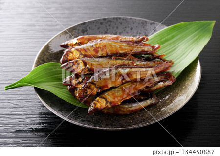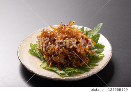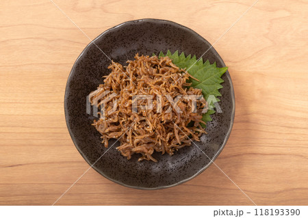 山椒佃煮(用醬油煮的食物)用小碗盛裝的山椒葉