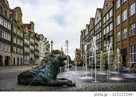 Four quarters fountain in Gdansk Poland. Lion sculptures and streets of the Gdansk downtown