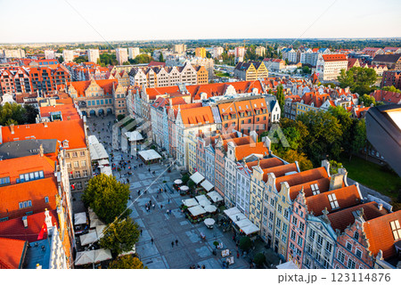 Aerial view of Gdansk at sunset, showcasing the downtown area and St. Mary's Basilica. The historical old city of Gdansk Poland.