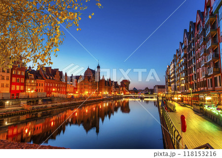 Gdansk old town and famous crane at night. View from Motlawa river. Poland at romantic night. The city also known as Danzig and the city of amber.