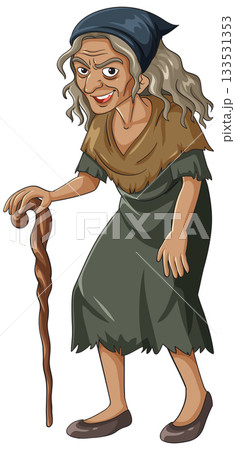 Elderly Woman with Cane in Tattered Dress Vector