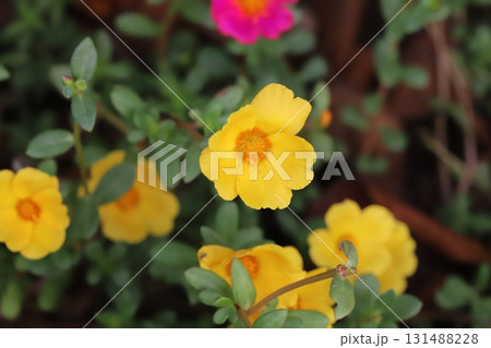 秋季公園裡盛開的粉紅色和黃色馬齒莧花