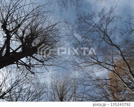 抬頭仰望湛藍的冬日天空,落葉樹光禿禿的枝幹在寂靜中展現出一種獨特的自然美。