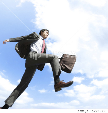一個穿著西裝的商務人士在藍天中奔跑