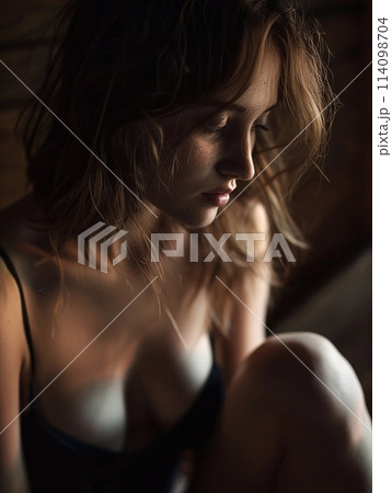 Low key studio portrait of a 35 year old white woman with naked shoulders, showing her muscled chest