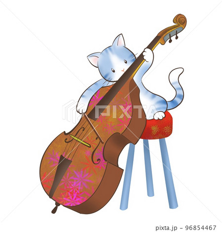 一頭大像用長鼻子翻閱樂譜,悠閒地演奏低音提琴的插圖