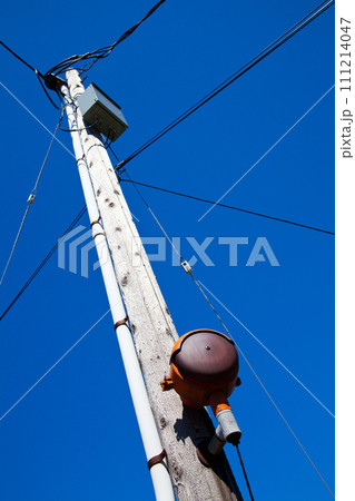 Low Angle View of Weathered Utility Pole Against Blue Sky in Urban Setting
