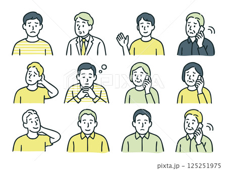 圖標插圖集的各種面部表情和男人的手勢(困擾的臉,電話,體貼)