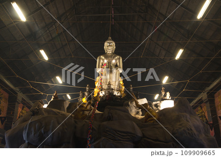 A large silver seated Buddha statue in the Pa Lelai pose. Inside the sermon hall At the bottom, devotees can walk under it. For good fortune at Wat Tha Mai temple.