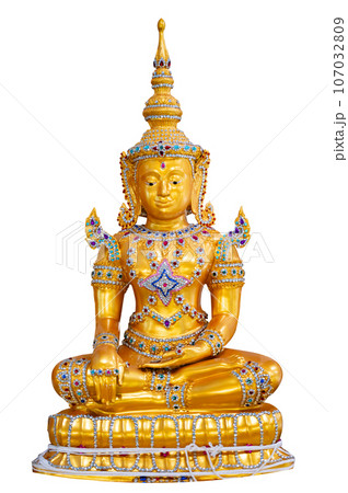 Standing golden Buddha at Sacred Hall in Wat Tha Mai temple. Located at Samut Sakhon Province in Thailand.