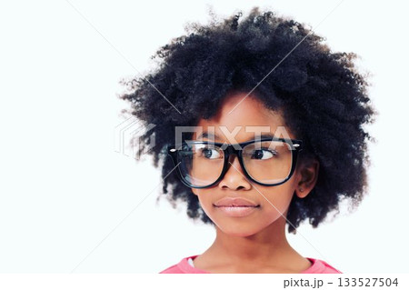 Close up of thoughtful girl with frizzy hair wearing big glasses