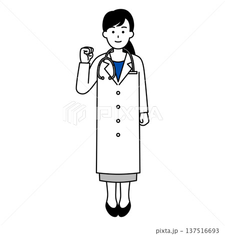 一位女醫生高興地舉起拳頭,同時比劃著向上的箭頭