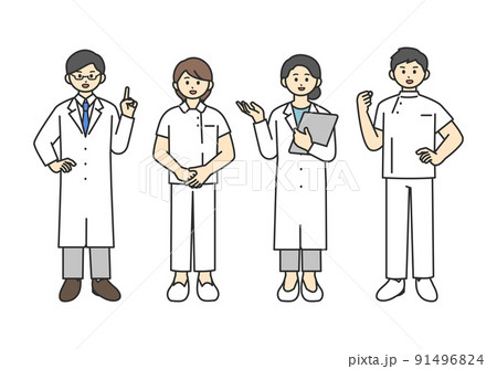 兩名男醫生和兩名女醫生從背後斜向上指,雙手叉腰。