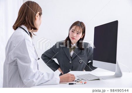 一名女醫生/護士在醫院內科檢查/採訪/諮詢患有胃潰瘍/腹痛的患者