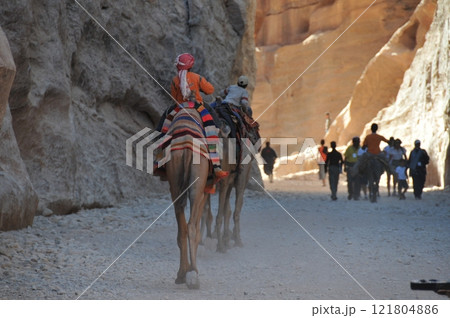 約旦,佩特拉,佩特拉遺址,艾爾卡茲尼(寶庫)前的廣場,西克的入口,駱駝